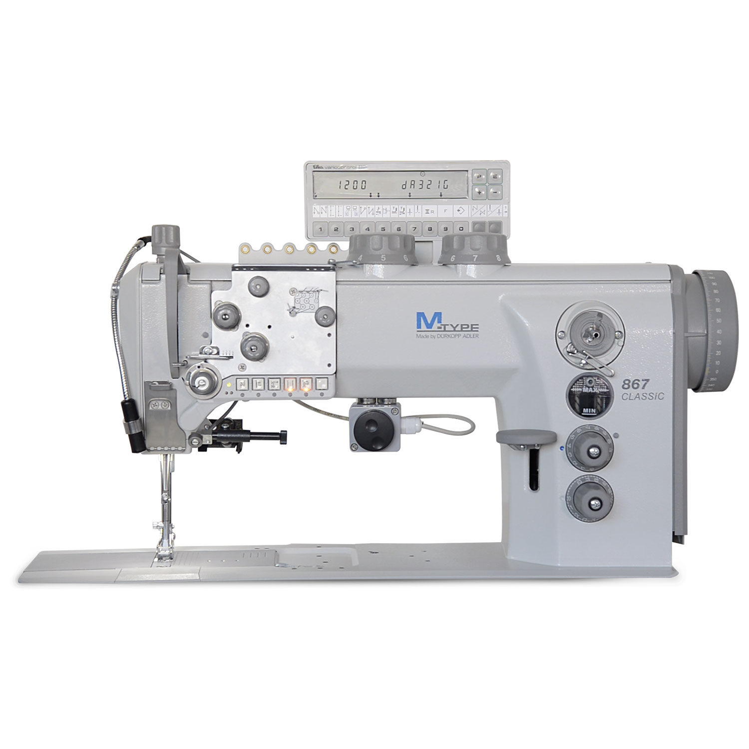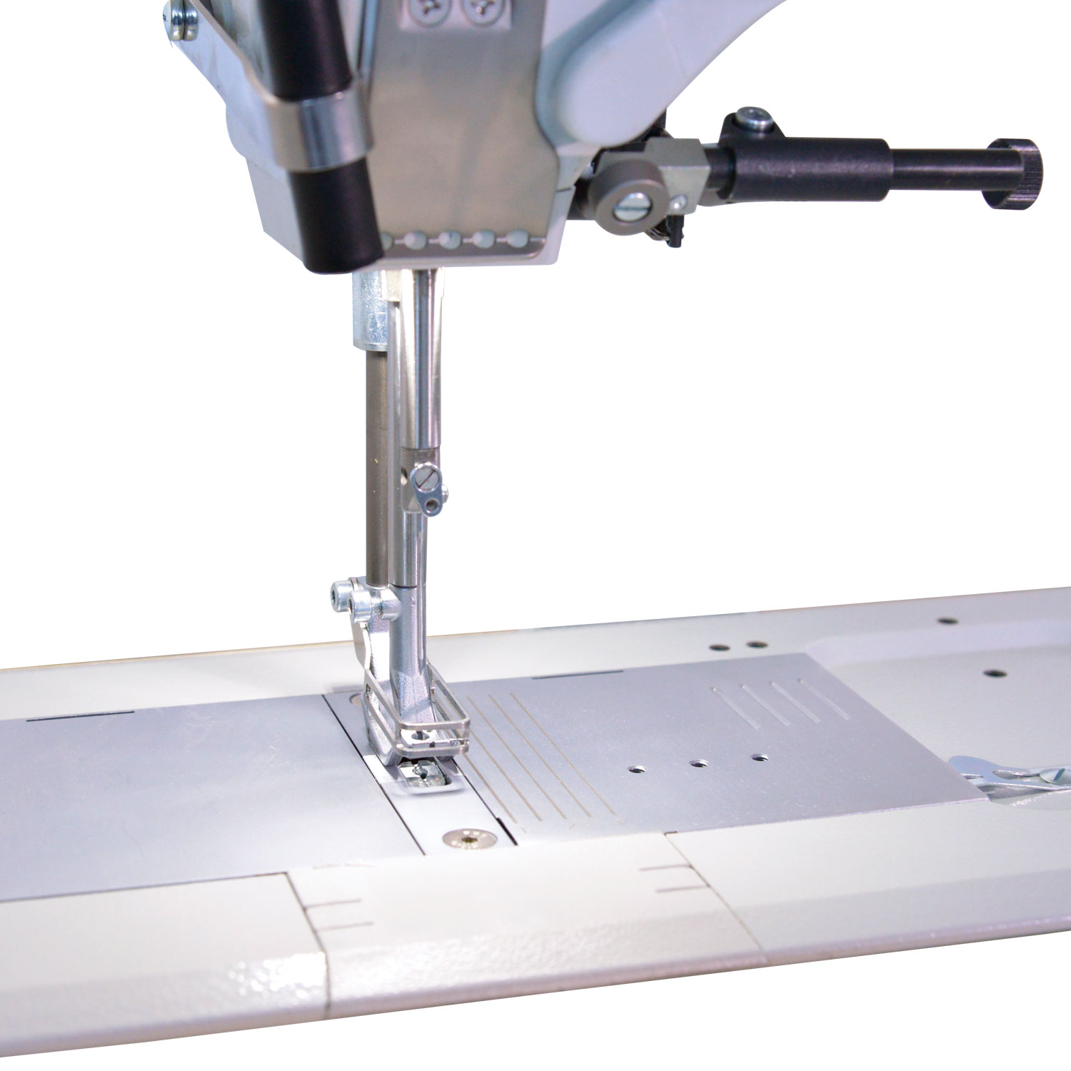 Flat sewing machine, single or double needle, triple feeding, needle feed and alternating feet with height adjustment up to 9 mm.