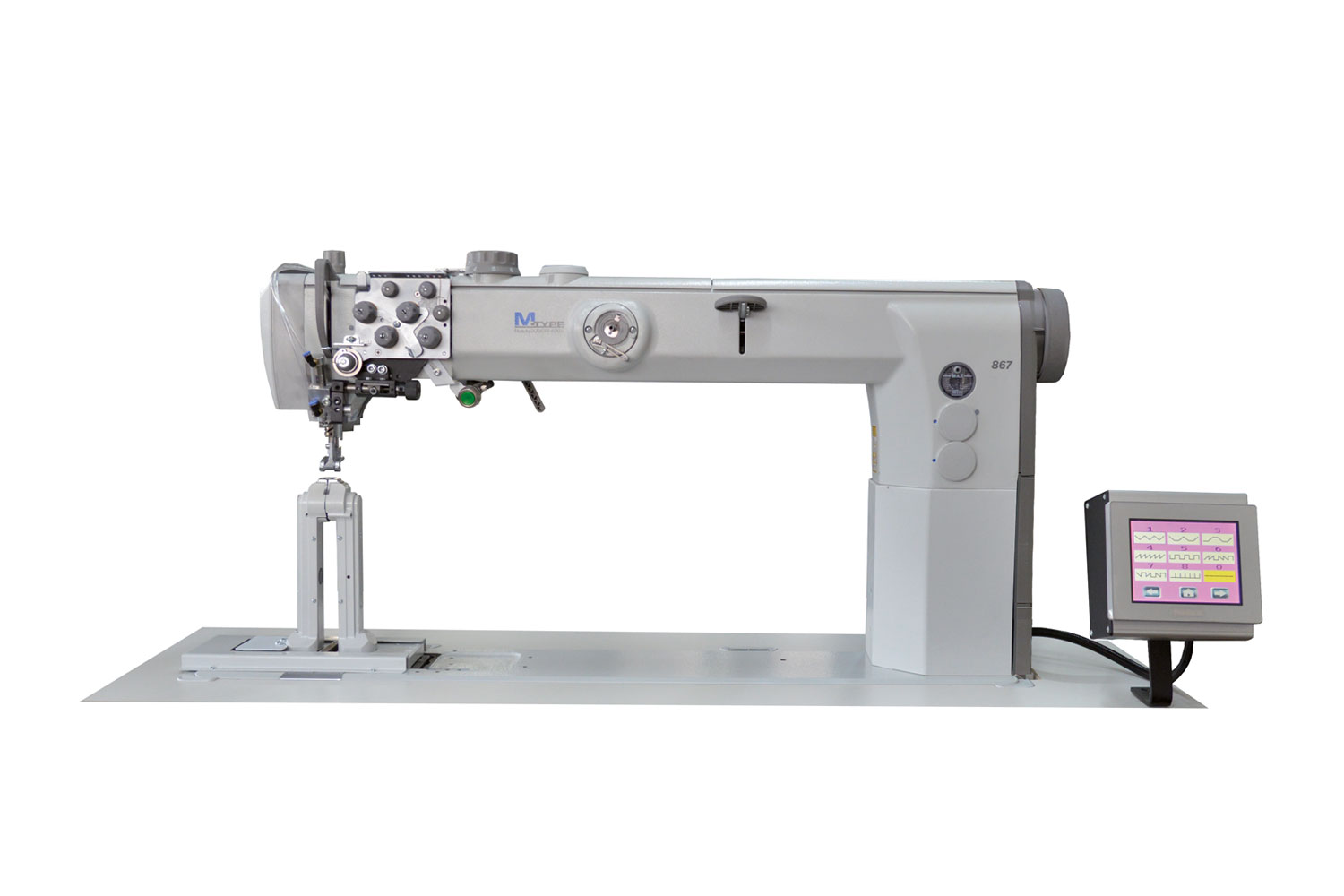 Macchina per cucire a colonna 2 aghi per punti ornamentali, triplice trasporto, punto annodato.