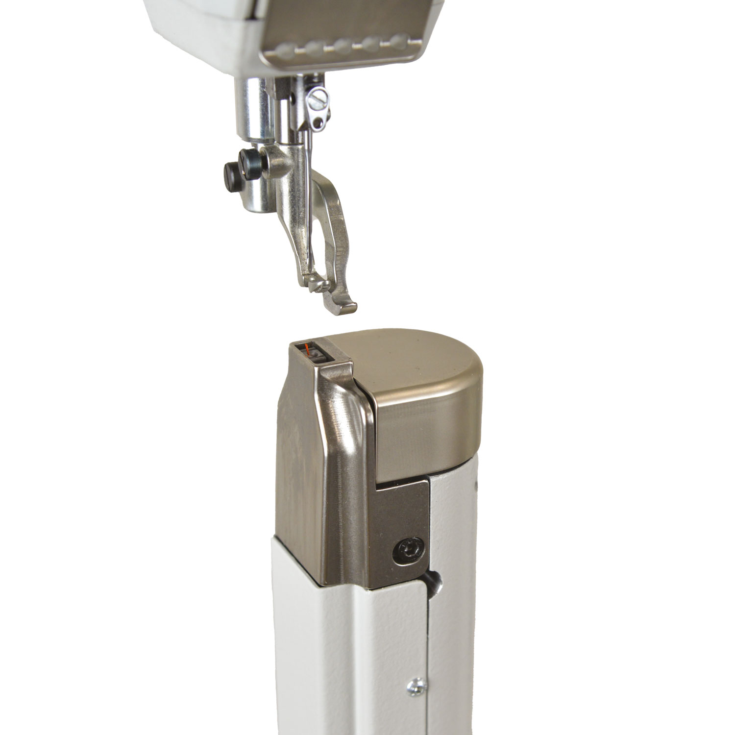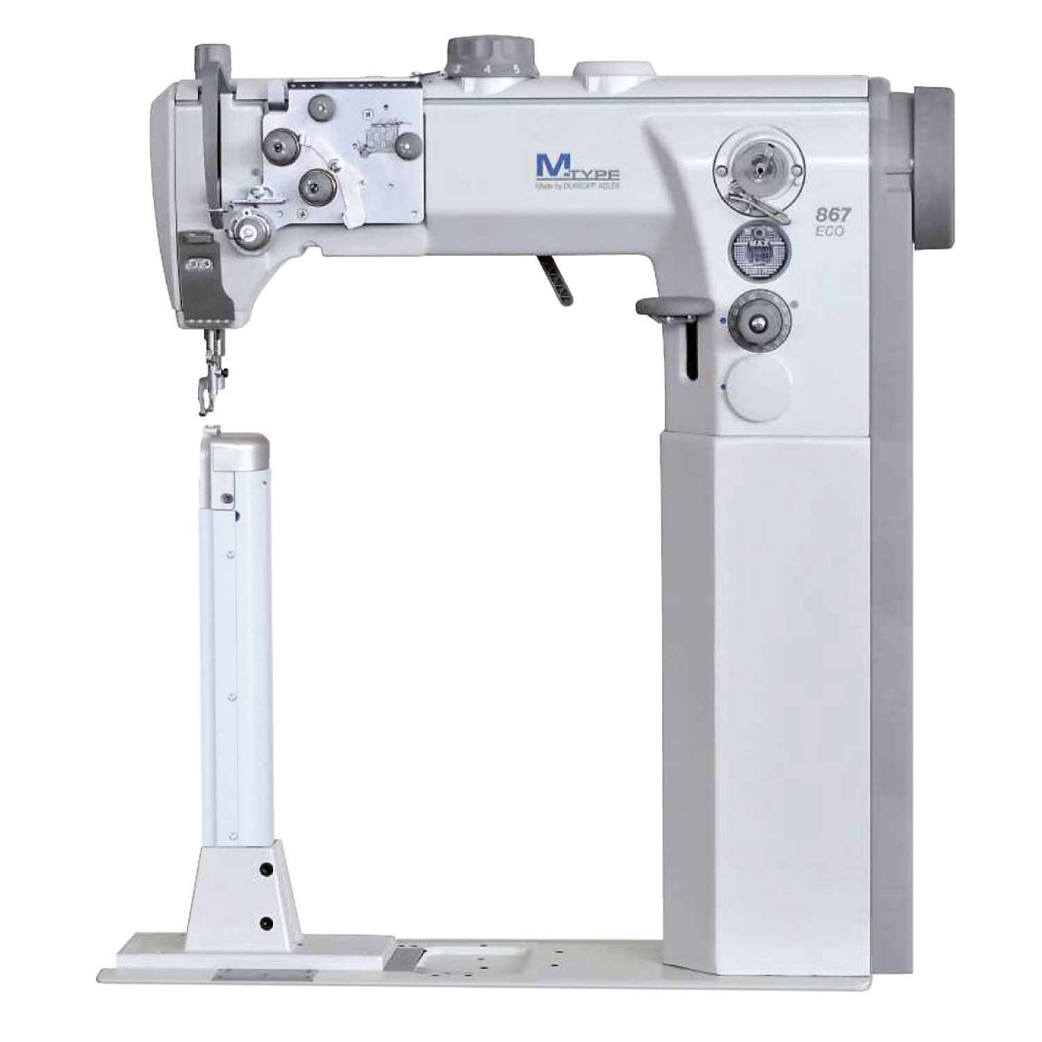 Macchina a colonna trasporto a griffa punta d’ago e piedini alternanti con altezza fino a 9 mm, punto annodato, completa di alzapiedino pneumatico.